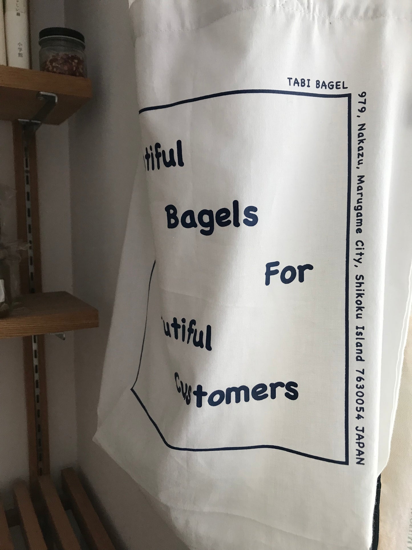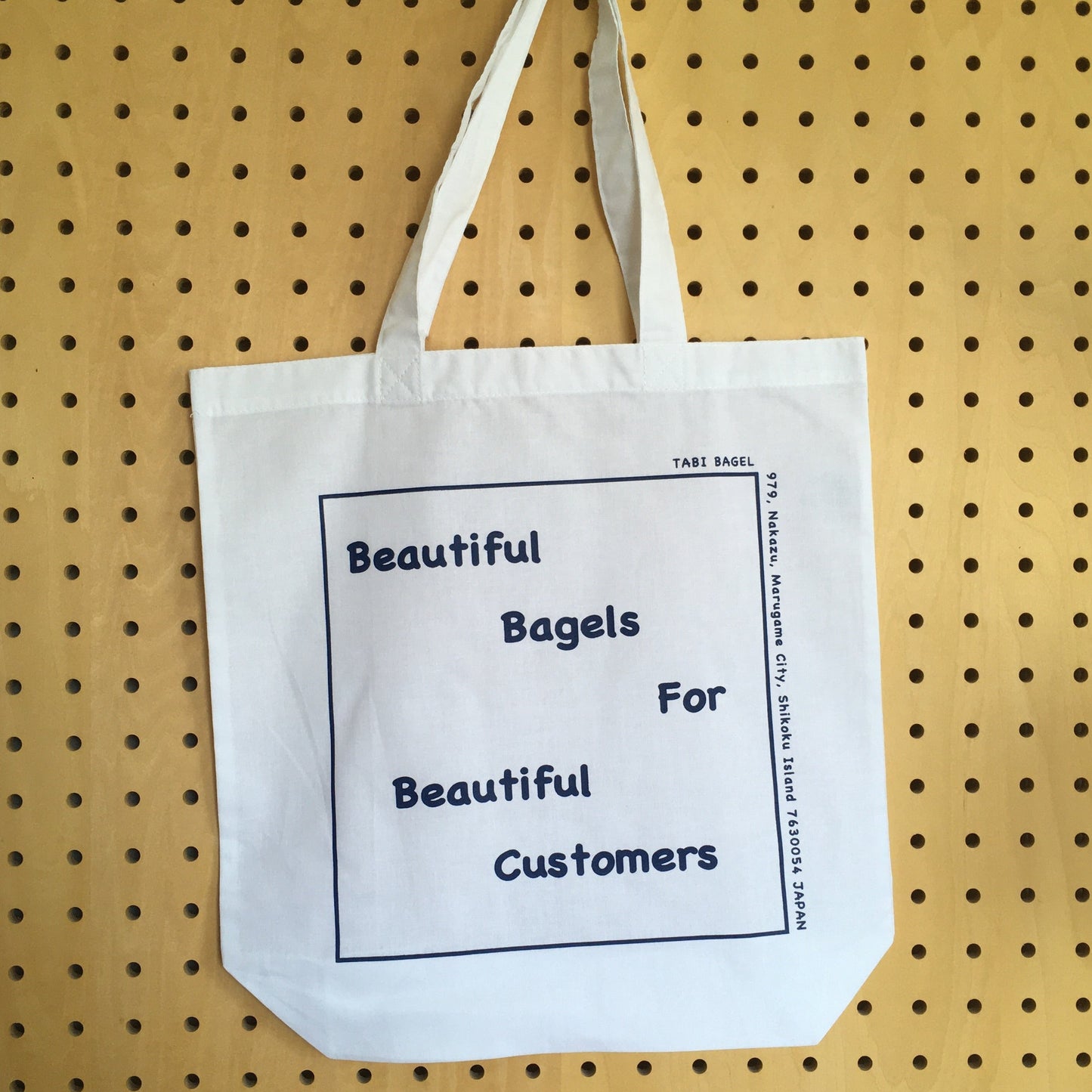 薄手の白いシーチング素材のボディに青色で「 BEAUTIFUL BAGELS FOR BEAUTIFUL CUSTOMERS」とメッセージが入った、旅ベーグルオリジナルのエコバッグです。